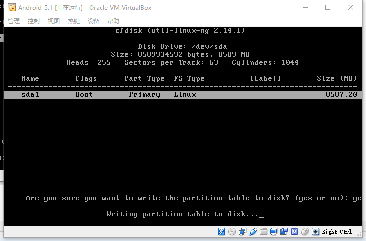 选择Write回车,然后填写yes并回车,把上面的操作全部写入磁盘,如下